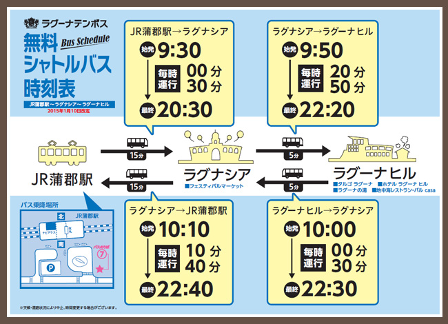 【シャトルバス】JR蒲郡駅から乗車し、ラグーナヒルで下車してください(所要時間:約20分)
